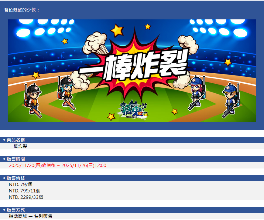 一棒炸裂禮盒異常狀況已排除,將於11/20例行維護後重新上架,造成各位少俠不便,敬請見諒。