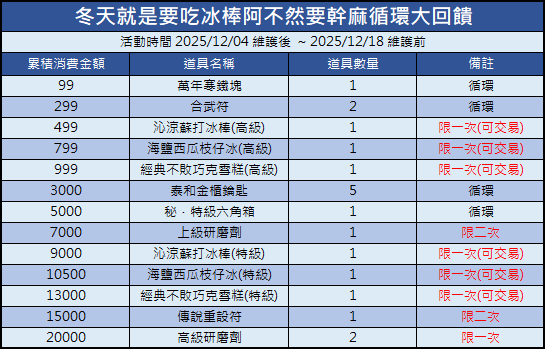 2025/12/04 (四) ~ 2025/12/18 (四) 消費回饋活動已更新,活動如下: