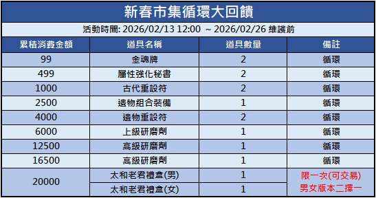 ※02/12因系統異常導致部分玩家異常獲得新春市集循環大回饋之道具,異常之道具後續已由系統統一回收。