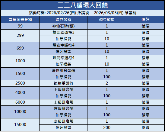 本次 2026/02/26 (四) ~ 2026/03/05 (四)  消費回饋活動已更新,活動如下: